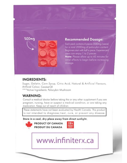 Ingredients: Sugar, Gelatin, Corn Syrup, Citric Acid, Natural & Artificial Flavours, Artificial Colour, Coconut Oil, Psilocybin Mushrooms.