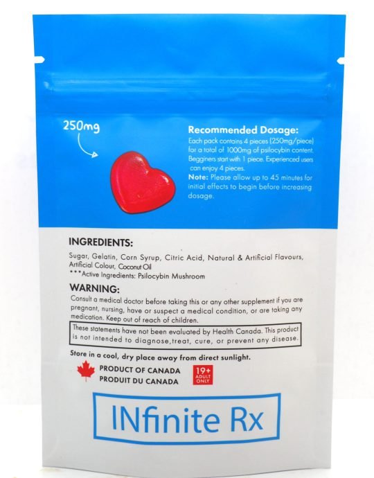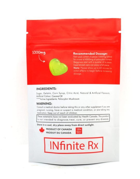 Ingredients: Sugar, Gelatin, Corn Syrup, Citric Acid, Natural & Artificial Flavours, Artificial Colour, Coconut Oil, Psilocybin Mushrooms.