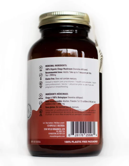 - Medicinal ingredients: 100% Fruiting Body Wild Harvested Canadian Chaga (Inonotus obliquus – fruiting body) 910mg / Vitamin C (Ascorbic Acid) 90mg