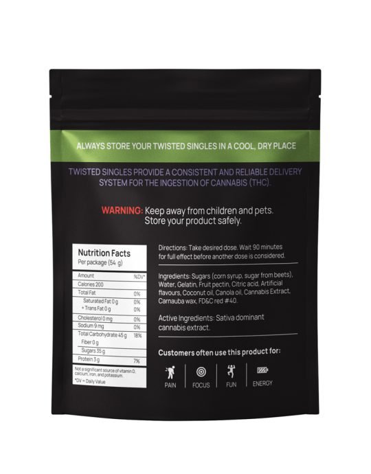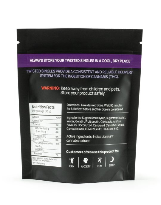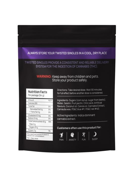 Take a bite into the bold, mouth-puckering flavor of Sour Blue Raspberry with Twisted Extracts’ Twisted Singles! Packed with 160mg of pure indica THC, this tasty treat offers the perfect balance of sweet and sour while delivering a deeply relaxing experience. Whether you’re winding down after a long day or looking for a tranquil night’s rest, these single-serve edibles are the perfect go-to for a calm, peaceful high.
